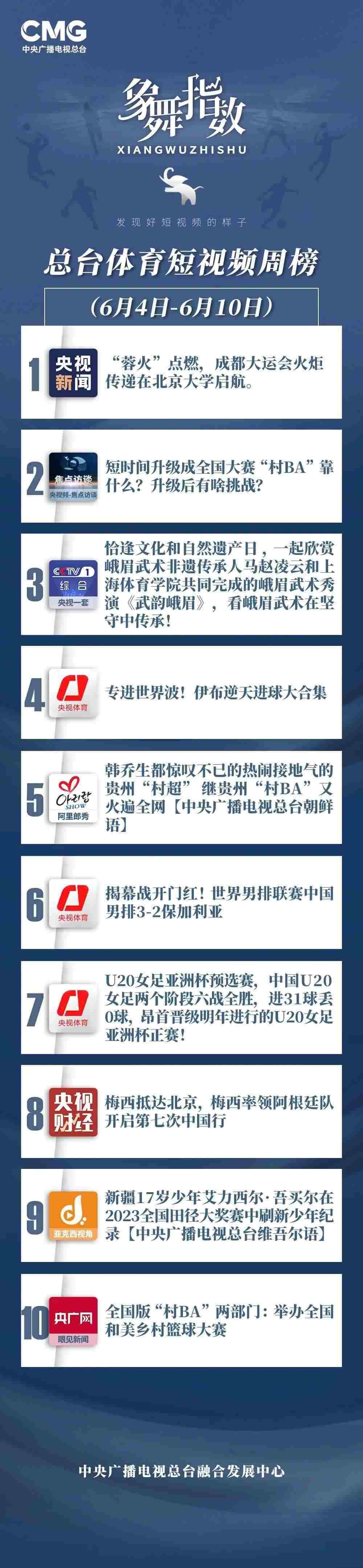 中央廣播電視總臺“象舞指數(shù)”評議品牌,推出體育短視頻周榜、總臺體育短視頻周榜。在6月4日—6月10日,以下內容獲得矚目:
