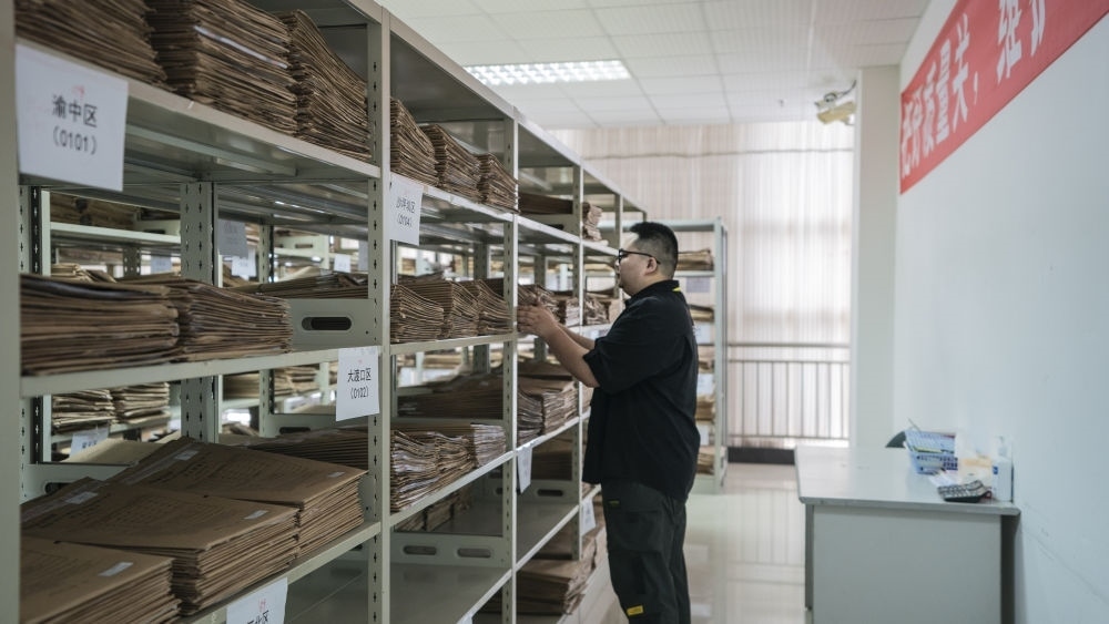 6月13日,在西南大學(xué)評卷點(diǎn),工作人員將完成掃描后的高考答卷及答題卡裝入檔案袋集中管理。新華社記者李前磊 攝