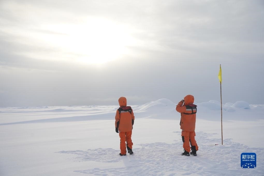 在北極點(diǎn)附近的冰站調(diào)查作業(yè)現(xiàn)場(chǎng),科考隊(duì)員在進(jìn)行防熊瞭望(9月5日攝)。新華社記者 魏弘毅 攝