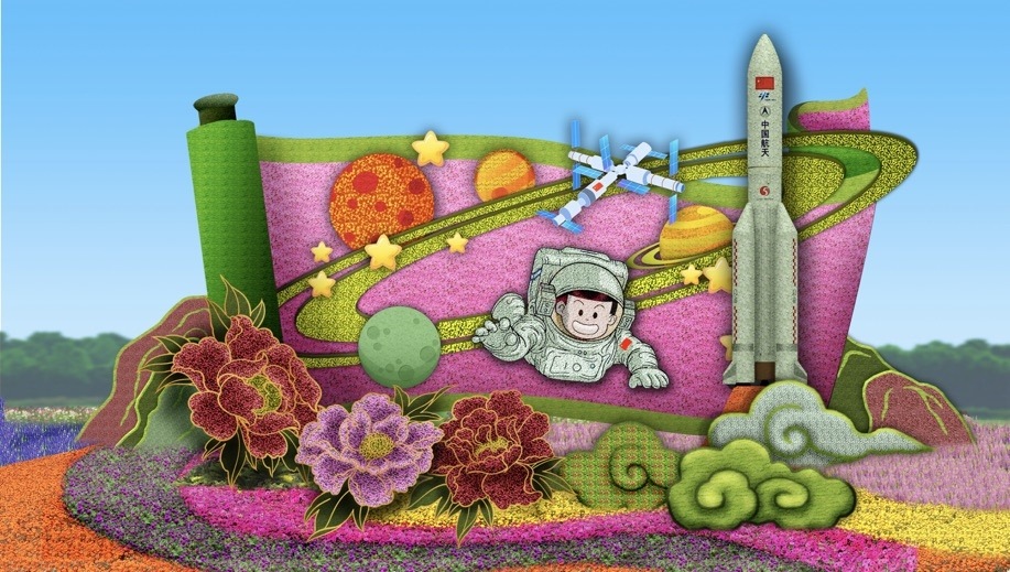 10,復(fù)興門(mén)東北角的“筑夢(mèng)未來(lái)”花壇頂高8.5米,以中國(guó)航天員、空間站為主景,寓意航天強(qiáng)國(guó)建設(shè)蓬勃發(fā)展,助力中國(guó)夢(mèng)早日實(shí)現(xiàn),全面推進(jìn)中華民族偉大復(fù)興,譜寫(xiě)新時(shí)代中國(guó)特色社會(huì)主義更加絢麗的華章。