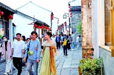 9月29日,湖北省宜昌市當(dāng)陽市關(guān)陵景區(qū)人頭攢動。不少游客身穿漢服,逛廟會、猜燈謎,重溫三國故事,共度佳節(jié)。
