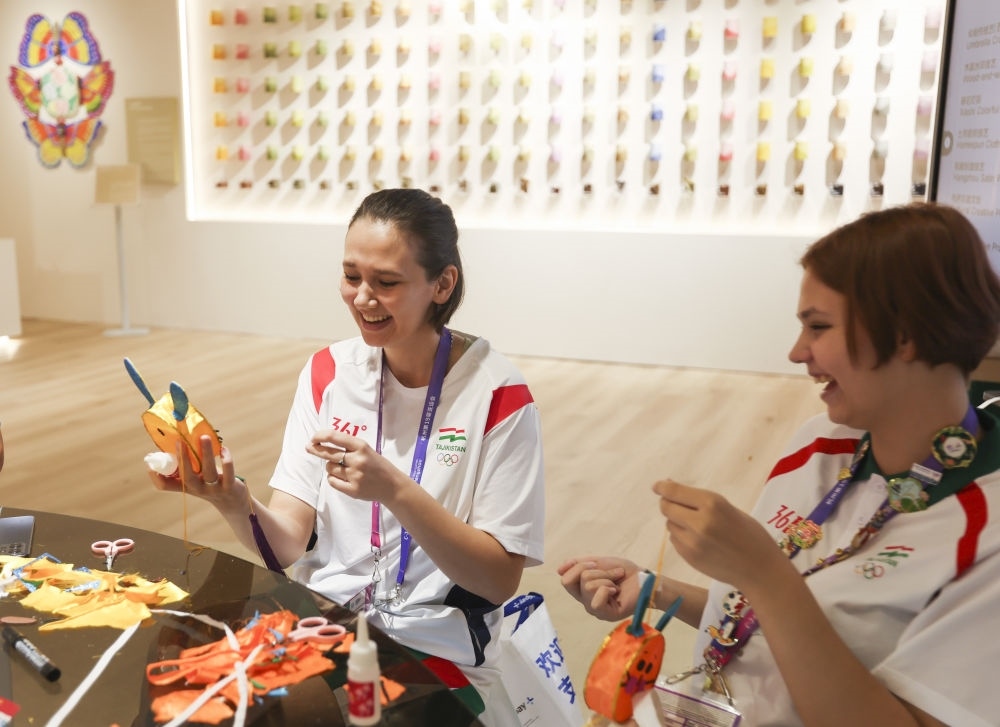 9月25日,一名日本運(yùn)動(dòng)員(右)在淳安賽區(qū)傳統(tǒng)工藝體驗(yàn)坊和志愿者合影。