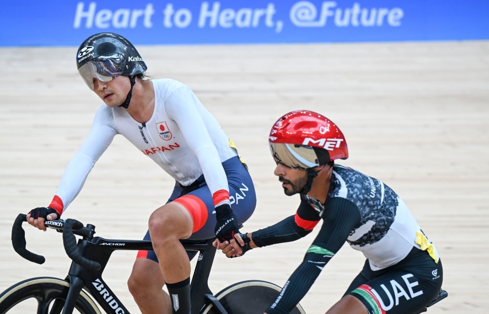 9月28日,日本選手窪木一茂(左)和阿聯(lián)酋選手艾哈邁德·曼蘇里在場(chǎng)地自行車男子全能賽沖刺賽后握手致意。