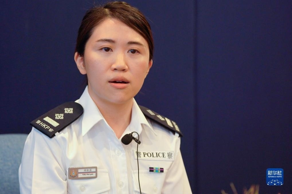 香港警務處支援科高級督察游凱茵接受采訪(4月19日攝)。新華社記者 龍鏡伊 攝