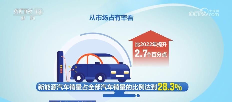 從市場占有率看,新能源汽車銷量占全部汽車銷量的比例達到28.3%,比2022年提升2.7個百分點。