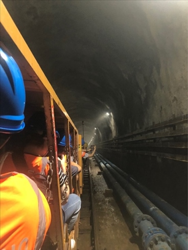 圖為采風(fēng)團乘坐纜車前往江門中微子地下實驗室。(新華網(wǎng) 王慰攝)