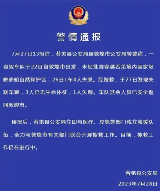 ·新疆若羌縣警方通報一車隊未經(jīng)批準穿越自然保護區(qū):3人無生命體征,1人失蹤。