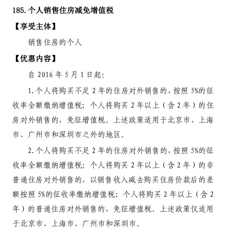 對于個人銷售住房減免增值稅的條件也未調(diào)整。即個人將購買不足2年的住房對外銷售的,按照5%的征收率全額繳納增值稅;個人將購買2年以上(含2年)的住房對外銷售的,免征增值稅。對于一線城市而言,個人將購買2年以上(含2年)的非普通住房對外銷售的,以銷售收入減去購買住房價款后的差額按照5%的征收率繳納增值稅。