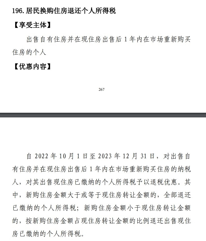 居民換購住房退還個人所得稅政策也已于2022年發(fā)布。按照規(guī)定,自2022年10月1日至2023年12月31日,對出售自有住房并在現(xiàn)住房出售后1年內(nèi)在市場重新購買住房的納稅人,對其出售現(xiàn)住房已繳納的個人所得稅予以退稅優(yōu)惠。其中,新購住房金額大于或等于現(xiàn)住房轉(zhuǎn)讓金額的,全部退還已繳納的個人所得稅;新購住房金額小于現(xiàn)住房轉(zhuǎn)讓金額的,按新購住房金額占現(xiàn)住房轉(zhuǎn)讓金額的比例退還出售現(xiàn)住房已繳納的個人所得稅。