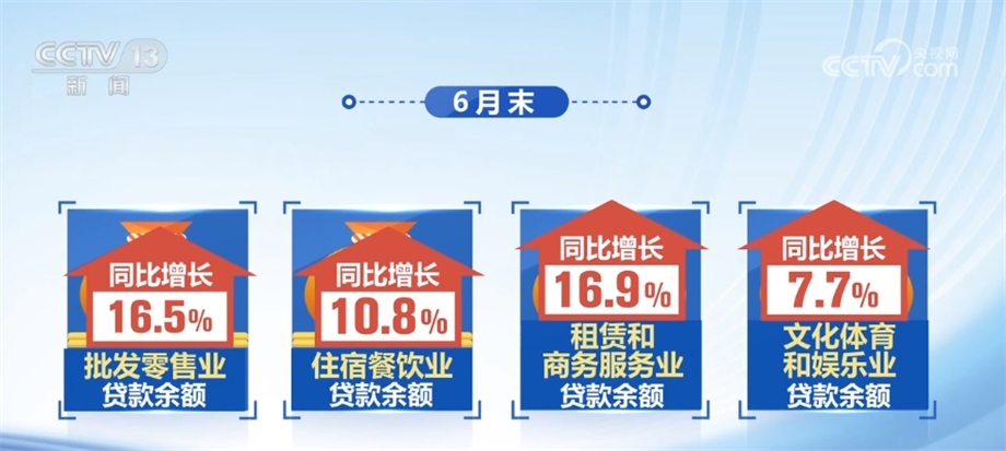 數(shù)據(jù)顯示,6月末,批發(fā)零售業(yè)、住宿餐飲業(yè)、租賃和商務服務業(yè)、文化體育和娛樂業(yè)貸款余額同比分別增長16.5%、10.8%、16.9%、7.7%,信用卡、汽車和其他綜合消費貸款比年初增加7100多億元,有力支持了相關領域消費恢復發(fā)展。