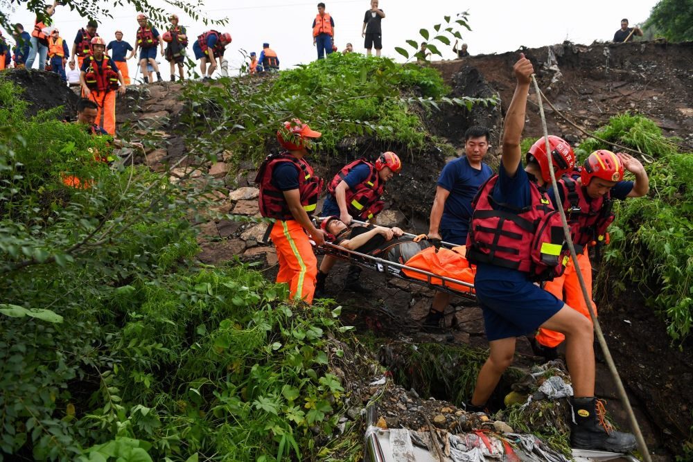 8月1日,在北京市門頭溝區(qū)水峪嘴村,在此增援的大興區(qū)消防救援支隊消防員在轉(zhuǎn)運(yùn)被困受傷的村民。新華社記者 鞠煥宗 攝