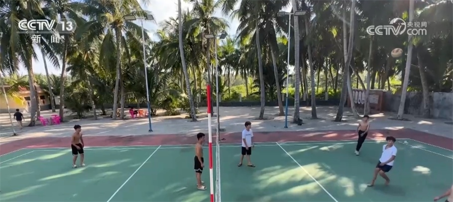 這塊掩映在椰林中的球場,是文昌市東郊鎮(zhèn)椰海村排球場,這是一塊標(biāo)準(zhǔn)大小的場地,球網(wǎng)、邊線一應(yīng)俱全。傍晚時(shí)分,天氣還比較炎熱,球場上已經(jīng)有不少孩子在打球。