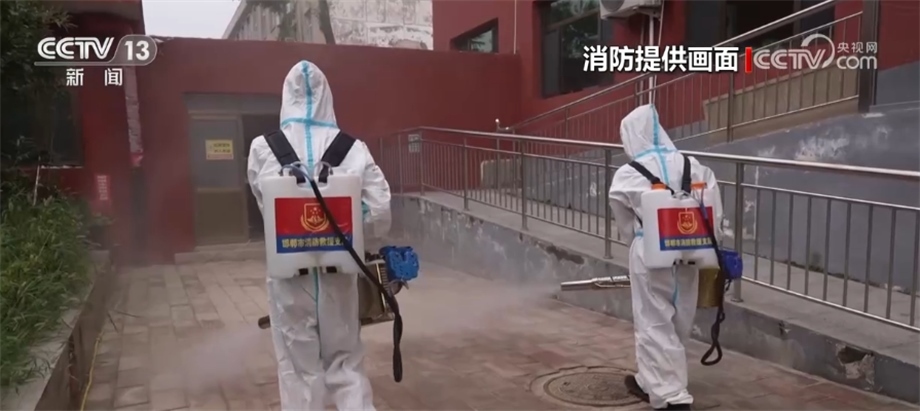 央視網(wǎng)消息:在河北涿州,消防員在多個(gè)小區(qū)、老年公寓等持續(xù)開展清淤排水消殺工作。