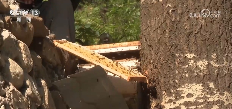 在暴雨災(zāi)害中,泗馬溝村的中華蜂養(yǎng)殖場的一些蜂箱進水,蜂王帶著蜂群飛到附近的樹洞里或樹杈上。蜂農(nóng)們用煙熏的方式將蜜蜂從樹洞中熏出來,再用巢脾將它們誘接回養(yǎng)殖蜂箱內(nèi)。目前,絕大部分被暴雨沖散的蜂群已被找回。