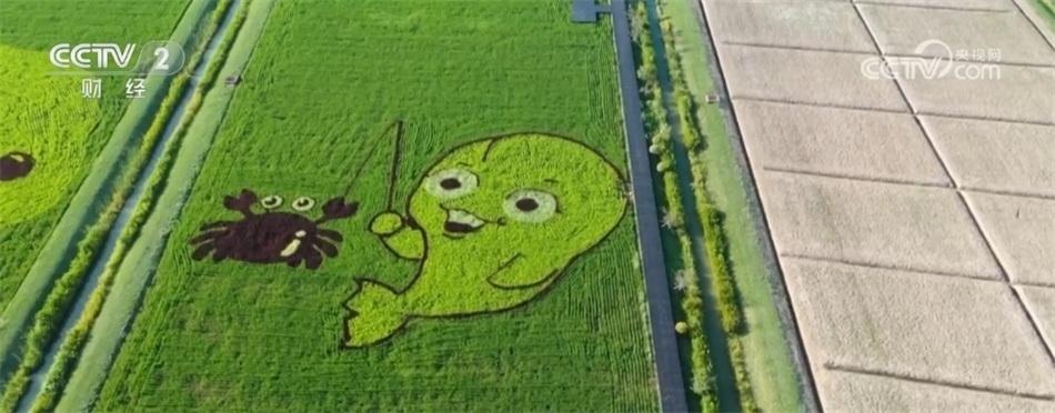 在崇明橫沙島,占地120畝的稻田畫也迎來了四方游客。稻田采用兒童畫的手法,以橘子、枇杷、車?yán)遄印ⅰ叭脴洹睘橹黝},展示生態(tài)發(fā)展成果。在“三棵樹”旁,一只小江豚正歡快地在江中釣著螃蟹,畫面靈動(dòng)有趣。另一邊,籃球場和運(yùn)動(dòng)員的圖案則展現(xiàn)了運(yùn)動(dòng)健兒們?cè)谫悎錾蠆^力拼搏的健美身姿。