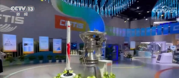 總臺(tái)記者 王豐:這片區(qū)域是綜合展的一個(gè)成就展的專題,這里集中展示了我國(guó)在服務(wù)業(yè)擴(kuò)大開放和服務(wù)貿(mào)易創(chuàng)新發(fā)展方面所取得的一系列成就。比如說這個(gè),這是我國(guó)民營(yíng)企業(yè)藍(lán)箭航天自主研發(fā)的朱雀二號(hào)火箭,旁邊是自主研發(fā)的天鵲發(fā)動(dòng)機(jī)。今年7月12日,朱雀二號(hào)成功發(fā)射升空,是世界上首款將載荷送入預(yù)定軌道的液氧甲烷火箭。