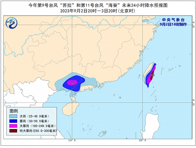 降水預(yù)報: 9月2日20時至3日20時,受“蘇拉”和“海葵”影響,廣西中南部、廣東西南部、臺灣島大部有大到暴雨,其中,廣西東南部、臺灣島東部等地部分地區(qū)有大暴雨,臺灣島東部局地有特大暴雨(250-300毫米)。