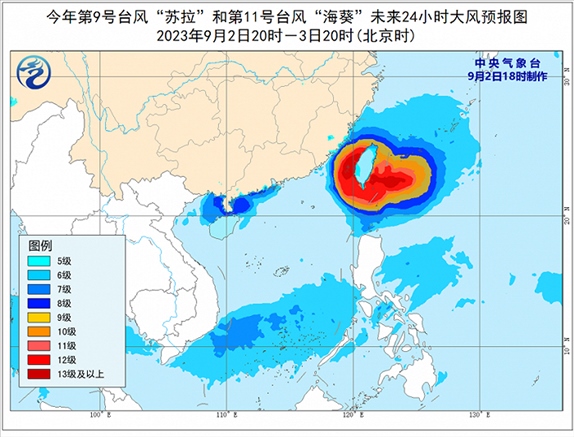 大風(fēng)預(yù)報:9月2日20時至3日20時,受“蘇拉”影響,廣東中西部沿海、廣西南部沿海、海南島北部沿海、珠江口及澳門等地將有6-7級大風(fēng),南海西北部、北部灣東部和瓊州海峽將有8級、陣風(fēng)9-10級的大風(fēng);受“??庇绊懀褪亢{南部、臺灣海峽西部、東海南部及釣魚島附近海域、浙江南部沿海、福建中北部沿海、臺灣島沿海將有6-8級、陣風(fēng)9-10級大風(fēng),巴士海峽北部、臺灣海峽東部、臺灣以東洋面及臺灣島南部沿海的風(fēng)力有9-12級,陣風(fēng)13-14級,“??敝行慕?jīng)過的附近海面或地區(qū)的風(fēng)力有13-16級,陣風(fēng)17級。