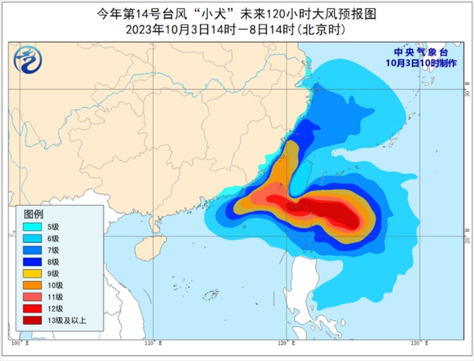 大風(fēng)預(yù)報:3日下午至8日,臺灣以東洋面、巴士海峽、東海大部、臺灣海峽、南海東北部以及杭州灣、浙江沿海、福建沿海、廣東東南部沿海以及臺灣島沿海將有6~8級大風(fēng),其中,臺灣以東洋面、巴士海峽、臺灣海峽、南海東北部部分海面、福建沿海、廣東東南部沿海、臺灣島東南部和西部沿海的風(fēng)力將有9~12級,“小犬”中心經(jīng)過的附近海面風(fēng)力可達(dá)13~16級,陣風(fēng)17級。