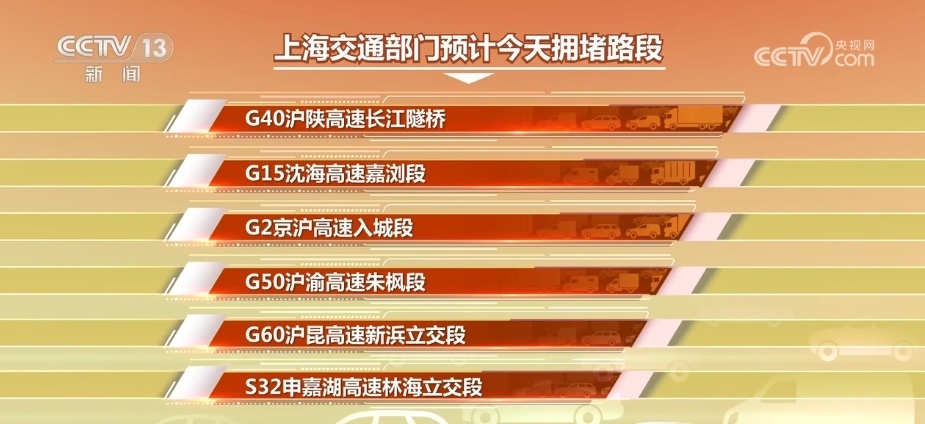 上海交通部門預計,返程高峰期間,G40滬陜高速長江隧橋、G15沈海高速嘉瀏段、G2京滬高速入城段、G50滬渝高速朱楓段、G60滬昆高速新浜立交段、S32申嘉湖高速林海立交段等入城方向將產生一定擁堵。