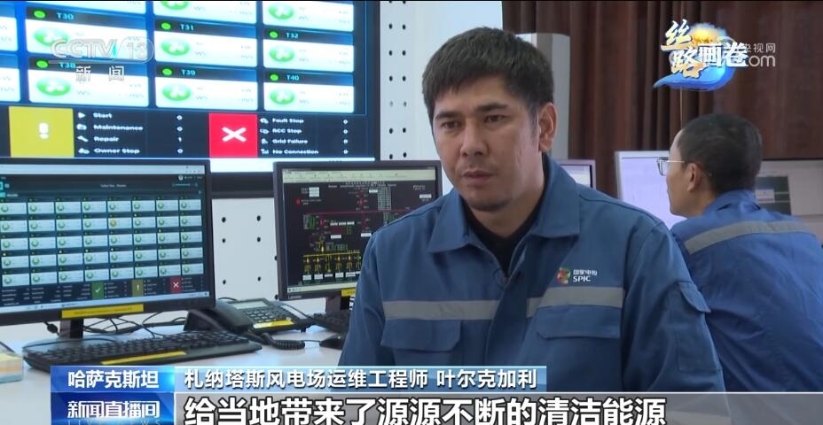 總臺(tái)記者 張譽(yù)耀:這里就是札納塔斯,哈薩克斯坦最大的風(fēng)力發(fā)電場(chǎng)之一,像我身后這樣一座風(fēng)能發(fā)電機(jī)能滿足當(dāng)?shù)丶s4000戶家庭的用電需求,而我身后一共有40座這樣的風(fēng)能發(fā)電機(jī),也就是說(shuō)能夠滿足當(dāng)?shù)?6萬(wàn)戶家庭的用電需求。正是這一座座轉(zhuǎn)動(dòng)的風(fēng)能發(fā)電機(jī),點(diǎn)亮了札納塔斯這座小城的日常生活。
