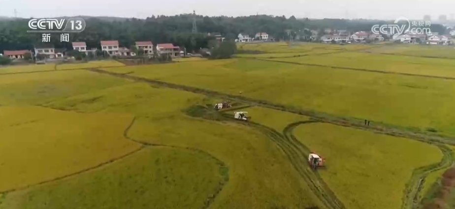 在湖南省常德市鼎城區(qū),連片的中稻迎來豐收。種糧大戶陳元普調(diào)度了3臺收割機前來搶收,很快30多畝稻田就完成了收割。