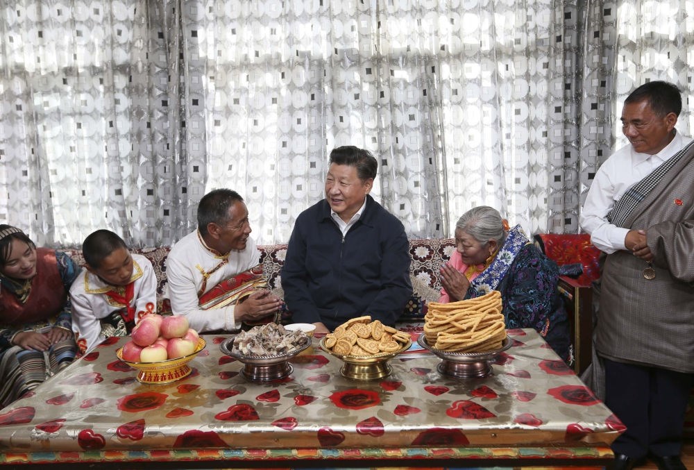 2016年8月22日,習(xí)近平在青海海西蒙古族藏族自治州格爾木市唐古拉山鎮(zhèn)長江源村藏族村民申格家中同一家人親切交談。