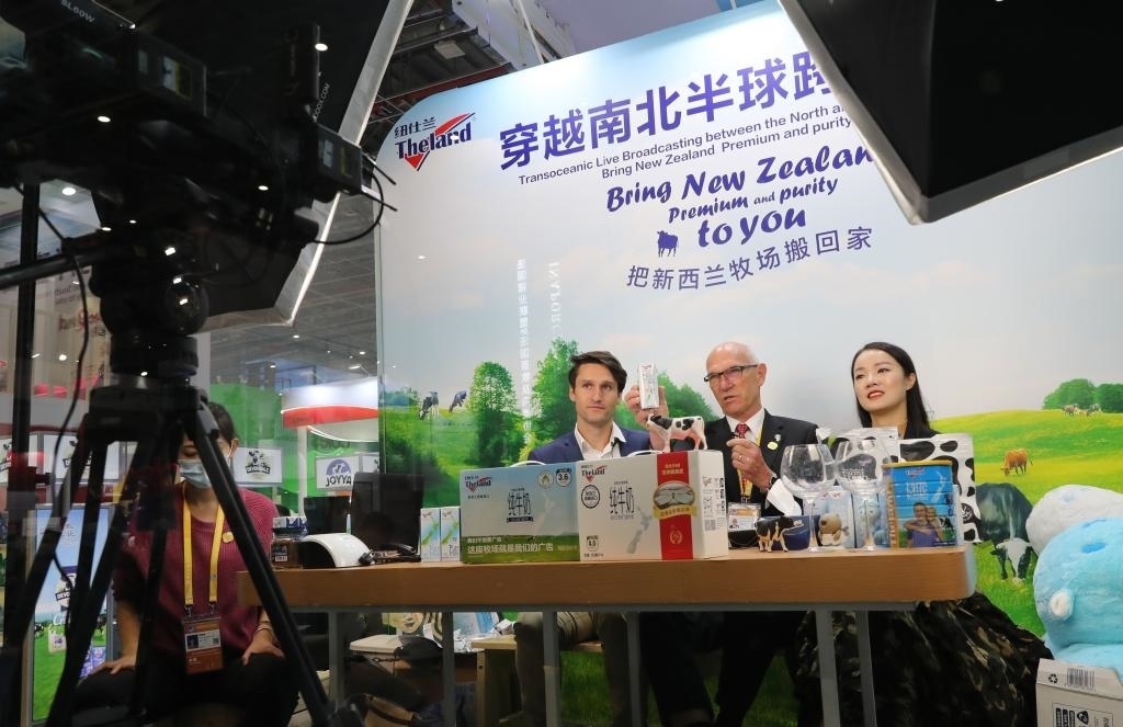 新西蘭紐仕蘭乳業(yè)有限公司執(zhí)行總裁羅伊·范登克(中)在第三屆進博會展臺上搭建的網(wǎng)絡直播間出鏡帶貨。新華社記者方喆 攝