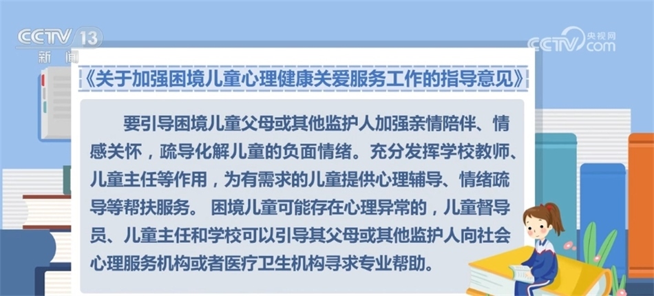 央視網(wǎng)消息:近日,民政部等五部門聯(lián)合印發(fā)《關(guān)于加強(qiáng)困境兒童心理健康關(guān)愛服務(wù)工作的指導(dǎo)意見》,通過(guò)加強(qiáng)心理健康教育、開展心理健康監(jiān)測(cè)等措施,全面提升困境兒童心理健康水平和身心健康素質(zhì)。
