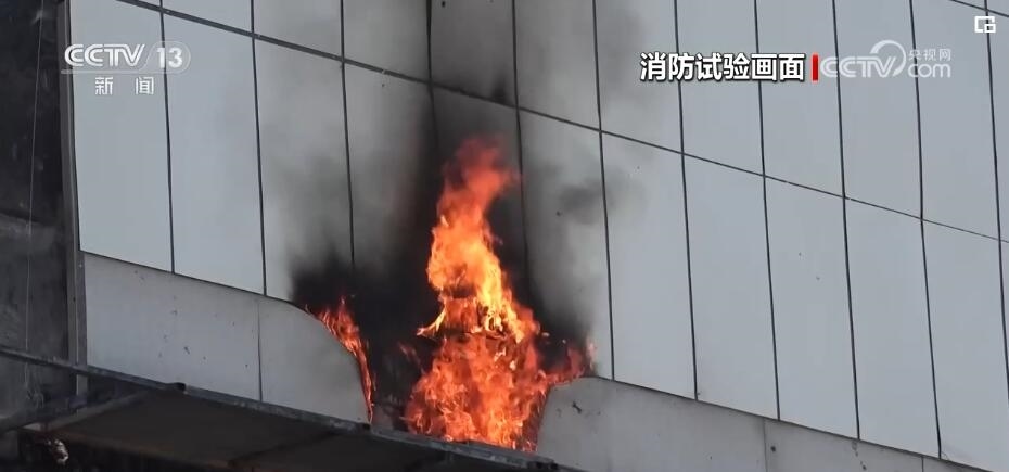 為了真實(shí)模擬高層保溫層火災(zāi)特性,消防滅火無(wú)人機(jī)噴射一分鐘高壓液體后就停止作業(yè)。此時(shí),過(guò)火鋁塑板周邊縫隙還不斷有黑煙冒出,大約2分鐘后,這些鋁塑板的縫隙里開(kāi)始出現(xiàn)明火,這就意味著鋁塑板下層的保溫層泡沫出現(xiàn)了復(fù)燃,與此同時(shí),滴落在下方平臺(tái)上的泡沫殘?jiān)查_(kāi)始復(fù)燃。5分鐘后,表層的鋁塑板被燒開(kāi),露出保溫層的熊熊火焰,同時(shí)與底部復(fù)燃的火焰上下貫通,外墻裝飾材料開(kāi)始更為猛烈的燃燒,大量的裝飾材料被點(diǎn)燃,直接砸向地面或者四處飄落,火災(zāi)有進(jìn)一步擴(kuò)大的風(fēng)險(xiǎn)。