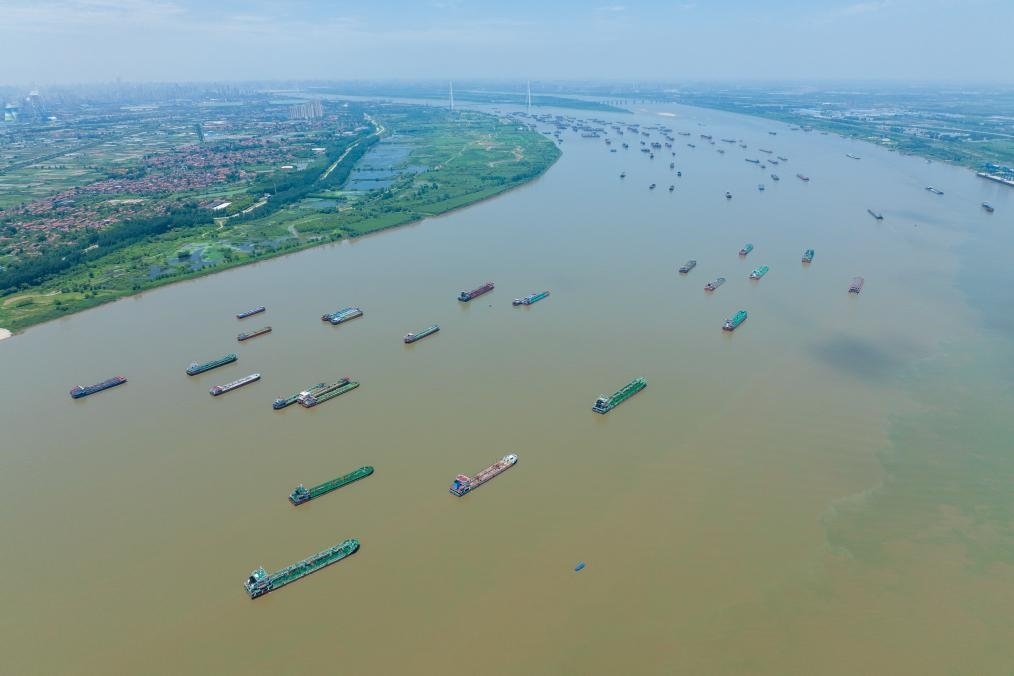 7月5日,船舶在武漢陽邏港區(qū)水域行駛(無人機(jī)照片)。新華社記者伍志尊 攝