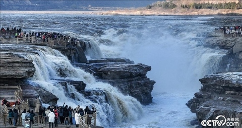 2023年11月14日,初冬時節(jié),陜西延安,游人在黃河壺口瀑布陜西側(cè)游覽觀瀑。
