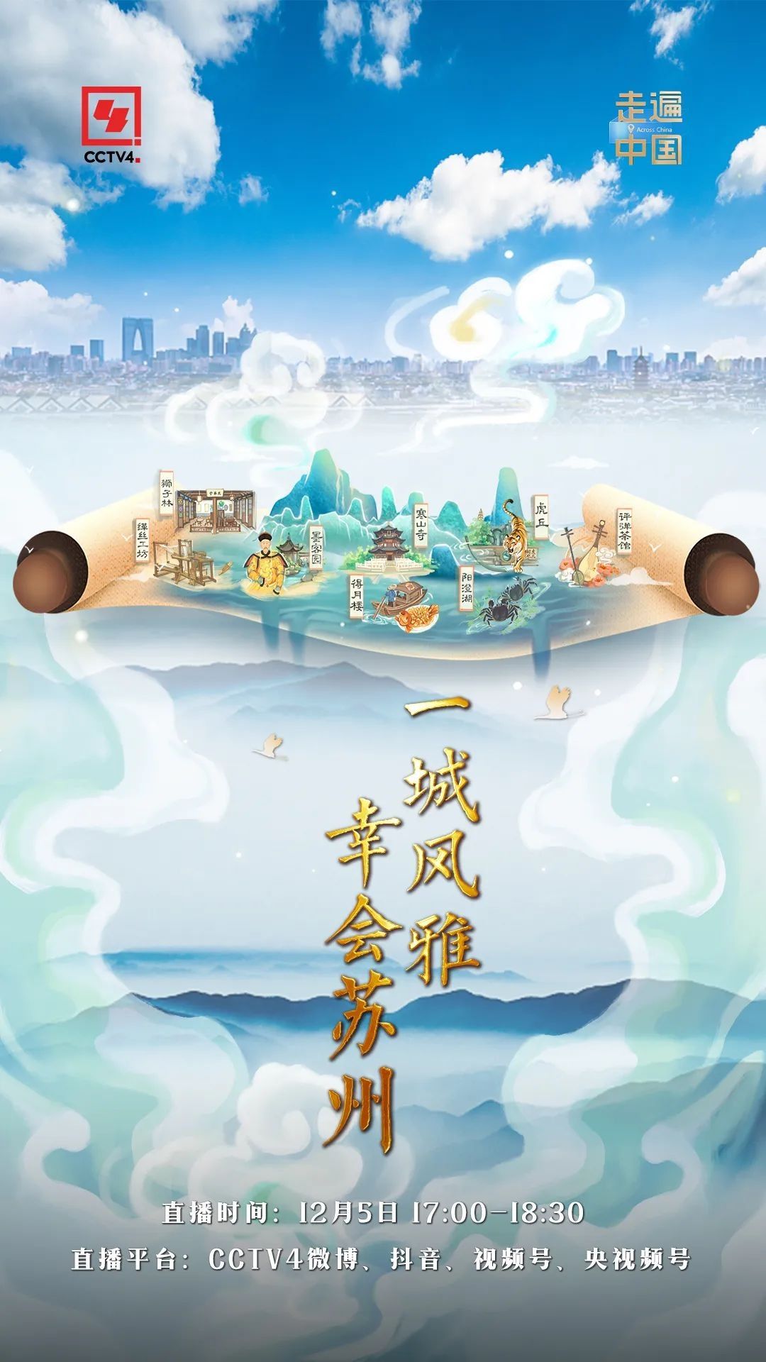 12月5日,《走遍中國(guó)》欄目于17:00在CCTV4微博、抖音、央視頻、微信視頻號(hào)平臺(tái)開(kāi)啟《一城風(fēng)雅 幸會(huì)蘇州》探訪直播。本次直播將由總臺(tái)主持人盧智與三位蘇州文旅推薦官趙曄、袁佳穎、林穗力一起,通過(guò)一張文旅地圖串聯(lián)古籍中8個(gè)蘇州點(diǎn)位,將蘇州美景、美食和民俗,從書(shū)本、筆墨中立體化展現(xiàn),形象生動(dòng)地為網(wǎng)友解讀帝王名家、文人墨客筆下的蘇州。點(diǎn)擊央視頻APP,搜索并關(guān)注“足不出戶,走遍中國(guó)”央友圈,更有機(jī)會(huì)贏取精美禮品!