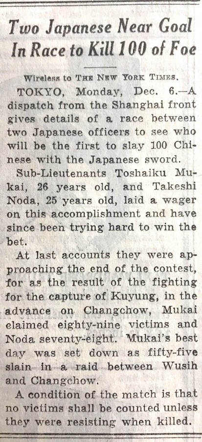 在1937年12月6日發(fā)行的《紐約時(shí)報(bào)》中,也登載了有關(guān)日軍“百人斬”殺人競(jìng)賽的報(bào)道。報(bào)道稱,來自上海前線的一份電報(bào)詳細(xì)介紹了兩名日本軍官之間的一場(chǎng)比賽,看誰先殺死100名中國人。年紀(jì)分別為25歲和26歲的日本軍官把賭注壓在了這項(xiàng)“成就”上。