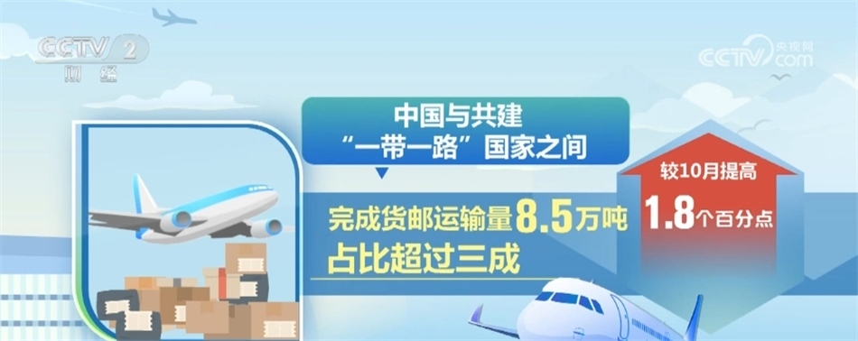 國(guó)際航線中,我國(guó)航空公司在中國(guó)至歐洲航線完成貨郵運(yùn)輸量最大,達(dá)10.9萬(wàn)噸,占比近四成;中國(guó)至亞洲其他國(guó)家航線貨運(yùn)恢復(fù)水平最高;中國(guó)至北美航線貨運(yùn)繼續(xù)恢復(fù),完成6.2萬(wàn)噸;中國(guó)與共建“一帶一路”國(guó)家之間完成貨郵運(yùn)輸量8.5萬(wàn)噸,占比超過(guò)三成,較10月提高1.8個(gè)百分點(diǎn)。