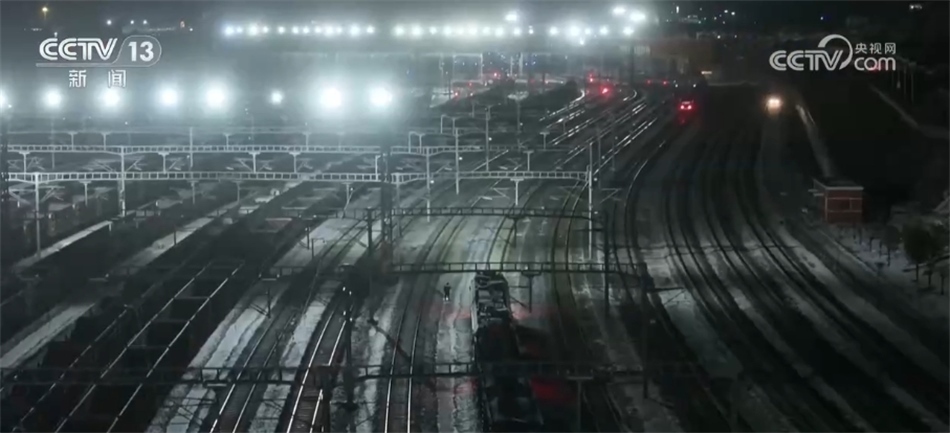 總臺央視記者 張叢婧:我這一下來,明顯感覺到冷了特別多,現(xiàn)在司機(jī)師傅就在這準(zhǔn)備做換車頭的工作。工作人員告訴我,在這個編組站里,現(xiàn)在幾乎每隔10分鐘就會有一列車編好組往外發(fā)出。我在車站里走了一會,就感覺已經(jīng)要被凍透了,大家可以看一下,現(xiàn)在這里的溫度是有零下將近24攝氏度。