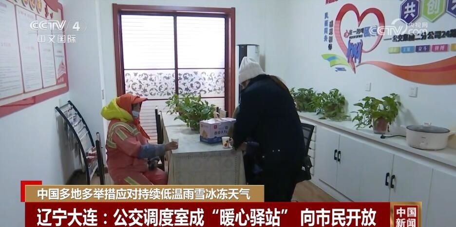 在遼寧大連,嚴(yán)寒天氣下,一些臨近居民區(qū)、菜市場、商業(yè)區(qū)的公交調(diào)度室臨時(shí)向市民開放,供路過市民歇腳、暖身。