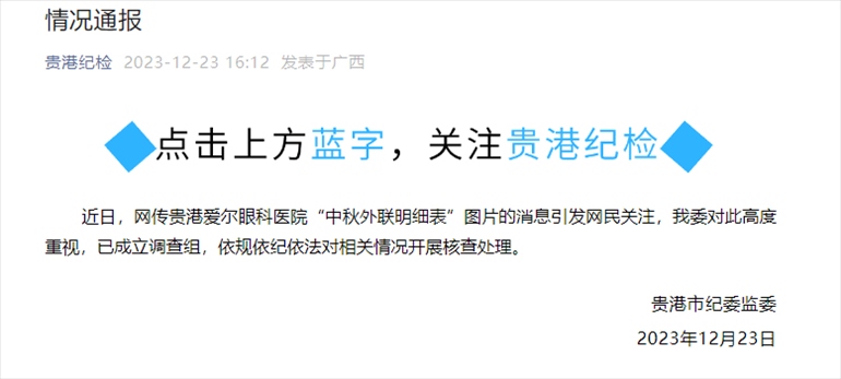 ·貴港市紀(jì)委通報(bào)“網(wǎng)傳愛爾眼科中秋外聯(lián)明細(xì)表”:已成立調(diào)查組,對(duì)相關(guān)情況開展核查處理。據(jù)早前報(bào)道,網(wǎng)友爆料發(fā)布了兩張標(biāo)為“中秋外聯(lián)明細(xì)表”的圖片,其中涉及42名公職人員以及59000元額度的購(gòu)物卡,并在評(píng)論中透露上述圖片的涉事單位為貴港愛爾眼科醫(yī)院。