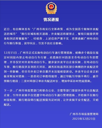 ·網(wǎng)傳廣州限制外賣配送?廣州市市場(chǎng)監(jiān)督管理局:嚴(yán)重不實(shí)。
