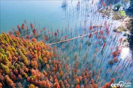 福建南平,延平區(qū)爐下鎮(zhèn)斜溪社區(qū)村洲頭島的落羽杉樹掩映閩江,色彩繽紛點(diǎn)綴冬日。