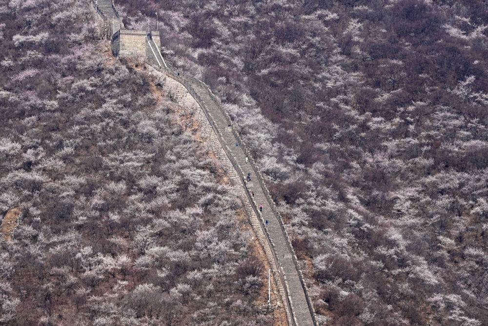 一列火車在北京水關(guān)長(zhǎng)城附近的山花中穿行(無(wú)人機(jī)照片,2020年3月27日攝)。