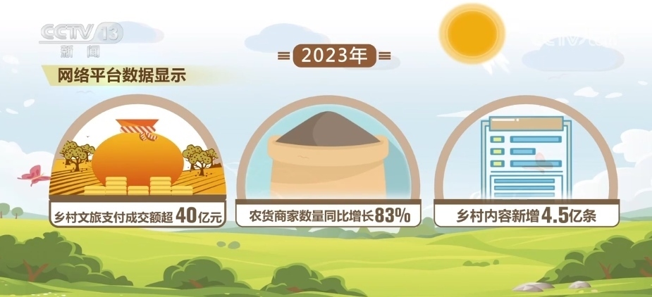 相關網(wǎng)絡平臺數(shù)據(jù)顯示,2023年,鄉(xiāng)村文旅支付成交額超40億元,農(nóng)貨商家數(shù)量同比增長83%,鄉(xiāng)村內(nèi)容新增4.5億條。數(shù)字技術和平臺在鄉(xiāng)村電商、鄉(xiāng)村文旅、鄉(xiāng)村人才等方面發(fā)揮了重要作用。