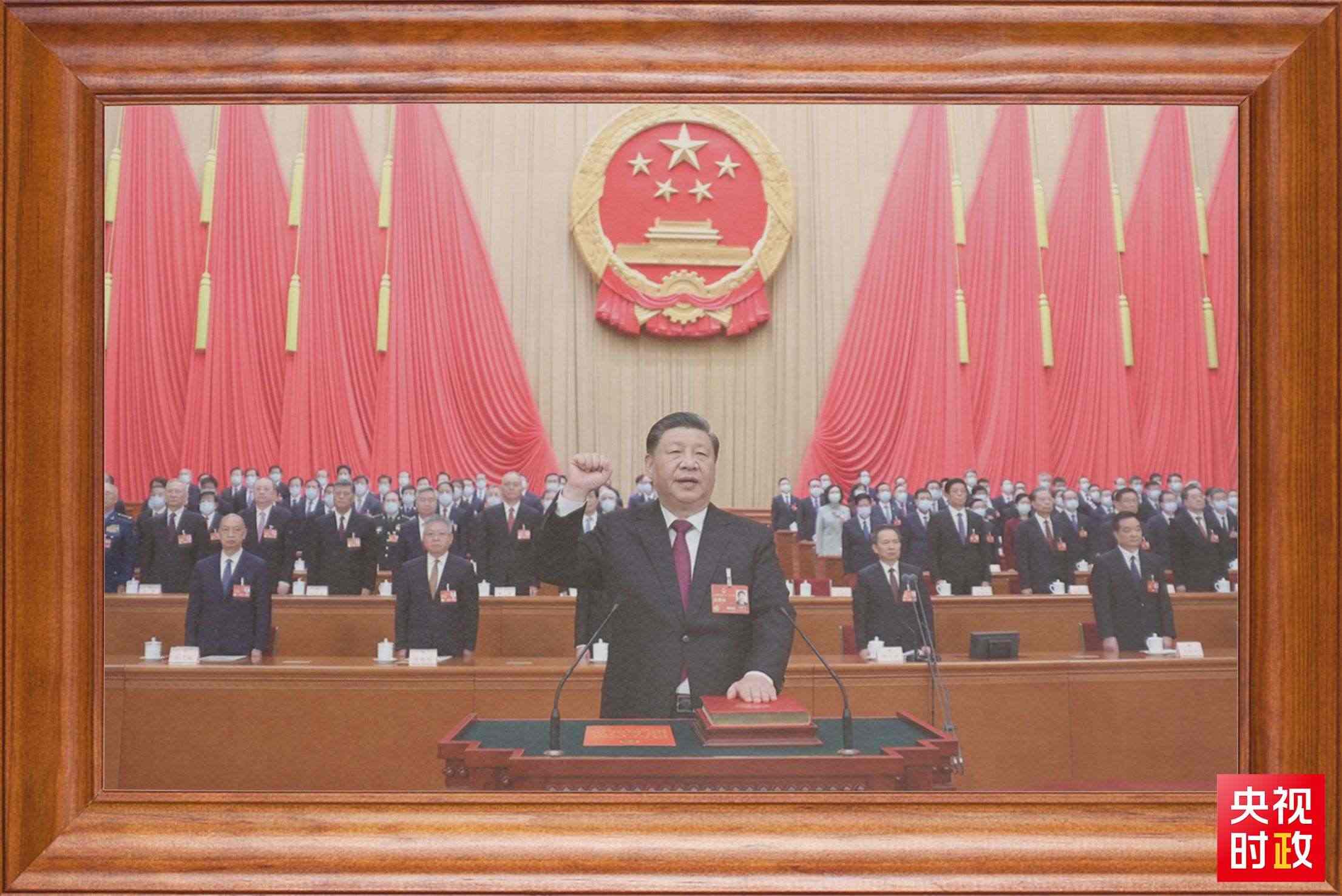 還有一張?zhí)貏e的照片。2023年3月10日,在北京人民大會堂,全票當選國家主席、中央軍委主席的習近平,左手撫按《中華人民共和國憲法》,右手舉拳,面向近3000名全國人大代表,鄭重宣誓。