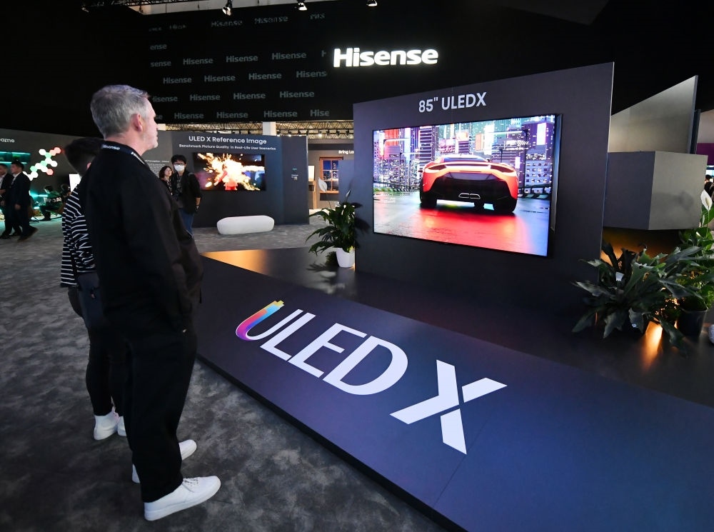 2023年9月1日,參觀者在德國柏林國際消費(fèi)電子展海信展區(qū)觀看ULED X參考級(jí)影像電視。新華社記者 任鵬飛 攝