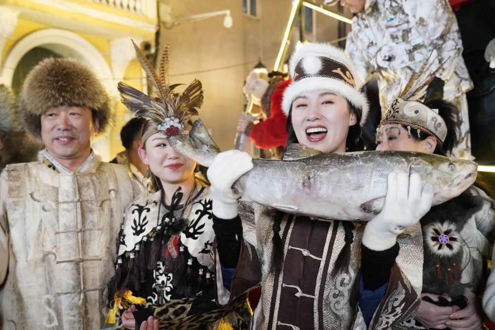 ↑1月6日,身著赫哲族服飾的饒河縣文旅推薦官在哈爾濱中央大街上推介家鄉(xiāng)特產魚品。