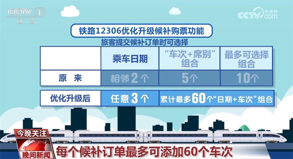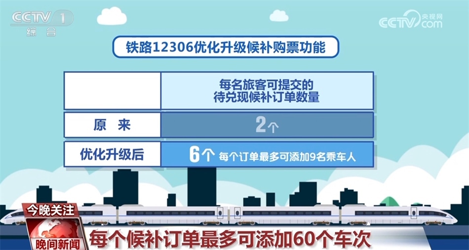 自1月11日零時起,鐵路12306優(yōu)化升級候補購票功能,來看一下具體變化:優(yōu)化升級后,每名旅客可提交的待兌現(xiàn)候補訂單數(shù)量由2個增至6個,每個訂單最多可添加9名乘車人;原來旅客提交候補訂單時,可選擇相鄰2個乘車日期、每個日期可選擇5個“車次+席別”的組合,最多可選擇10個組合。優(yōu)化升級后,旅客可選擇預(yù)售期內(nèi)任意3個乘車日期,累計最多可選擇60個“日期+車次”的組合;原來候補訂單截止兌現(xiàn)時間最晚為開車前2小時,優(yōu)化升級后調(diào)整為開車前20分鐘。