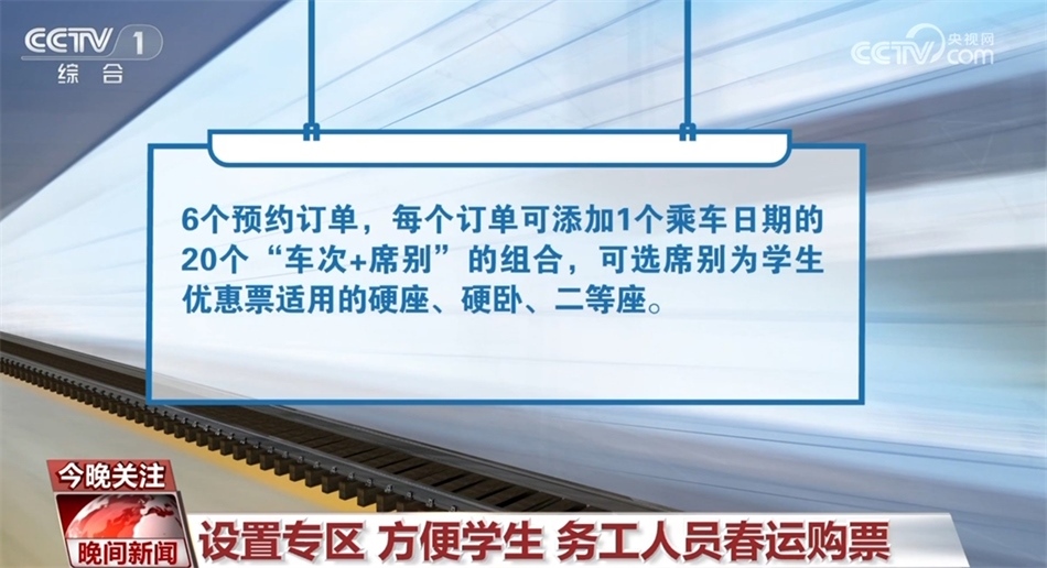 此外,符合條件的學(xué)生旅客(已通過學(xué)生優(yōu)惠資質(zhì)核驗且有剩余優(yōu)惠乘車次數(shù))可通過“學(xué)生寒假訂票專項服務(wù)”專區(qū)預(yù)約購買春運期間(1月26日至3月5日)火車票,每名旅客最多可同時提交6個預(yù)約訂單,每個訂單可添加1個乘車日期的20個“車次+席別”的組合,可選席別為學(xué)生優(yōu)惠票適用的硬座、硬臥、二等座。