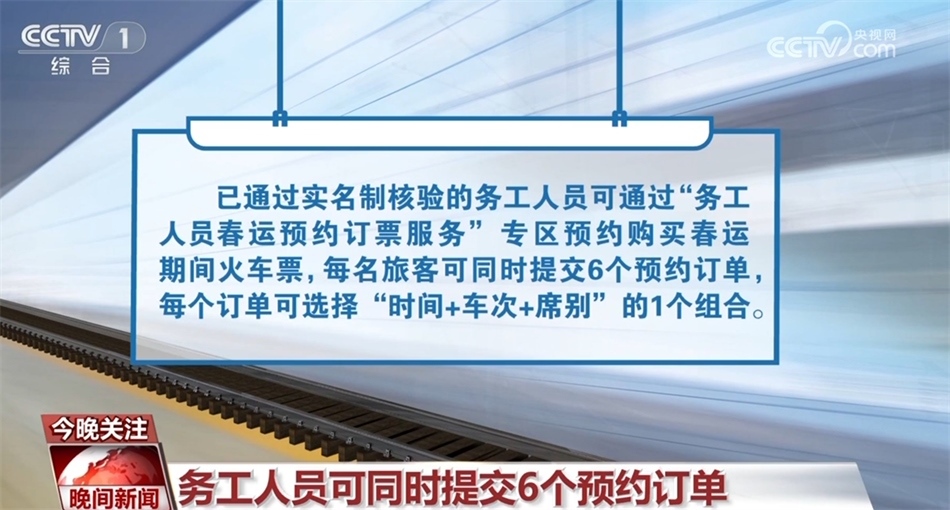 已通過實名制核驗的務(wù)工人員可通過“務(wù)工人員春運預(yù)約訂票服務(wù)”專區(qū)預(yù)約購買春運期間火車票,每名旅客可同時提交6個預(yù)約訂單,每個訂單可選擇“時間+車次+席別”的1個組合。