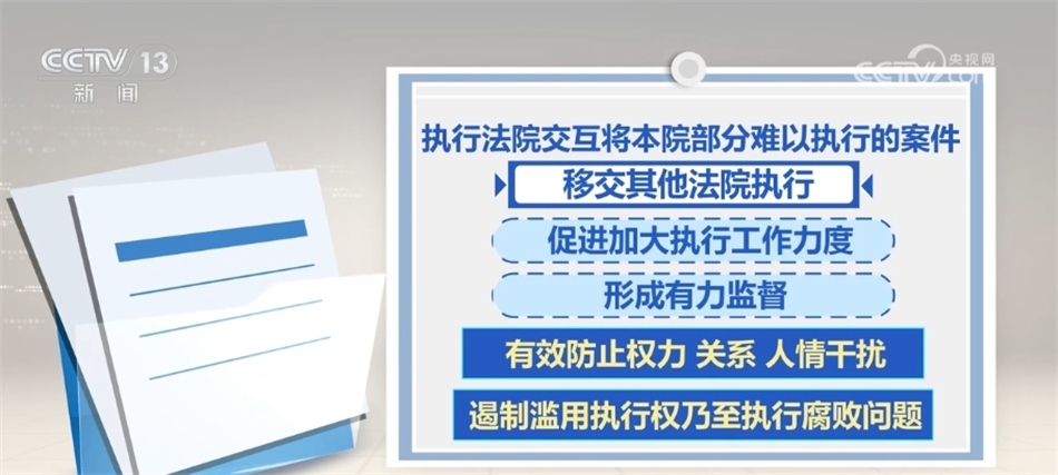 2023年10月,最高人民法院部署開展交叉執(zhí)行工作試點(diǎn)。據(jù)介紹,交叉執(zhí)行是指通過(guò)指定、提級(jí)執(zhí)行,執(zhí)行法院交互將本院部分難以執(zhí)行的案件移交其他法院執(zhí)行,促進(jìn)加大執(zhí)行工作力度,并形成有力監(jiān)督,有效防止權(quán)力、關(guān)系、人情干擾,遏制濫用執(zhí)行權(quán)乃至執(zhí)行腐敗問(wèn)題。