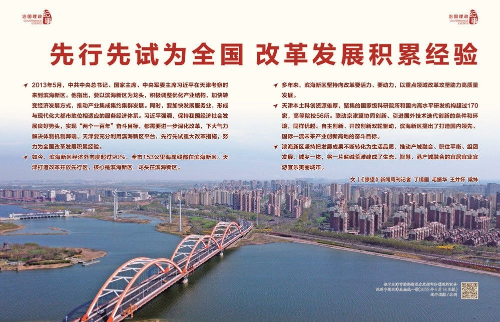 ◇2013年5月,中共中央總書記、國(guó)家主席、中央軍委主席習(xí)近平在天津考察時(shí)來(lái)到濱海新區(qū)。他指出,要以濱海新區(qū)為龍頭,積極調(diào)整優(yōu)化產(chǎn)業(yè)結(jié)構(gòu),加快轉(zhuǎn)變經(jīng)濟(jì)發(fā)展方式,推動(dòng)產(chǎn)業(yè)集成集約集群發(fā)展。同時(shí),要加快發(fā)展服務(wù)業(yè),形成與現(xiàn)代化大都市地位相適應(yīng)的服務(wù)經(jīng)濟(jì)體系。習(xí)近平強(qiáng)調(diào),保持我國(guó)經(jīng)濟(jì)社會(huì)發(fā)展良好勢(shì)頭,實(shí)現(xiàn)“兩個(gè)一百年”奮斗目標(biāo),都需要進(jìn)一步深化改革,下大氣力解決體制機(jī)制弊端。天津要充分利用濱海新區(qū)平臺(tái),先行先試重大改革措施,努力為全國(guó)改革發(fā)展積累經(jīng)驗(yàn)。